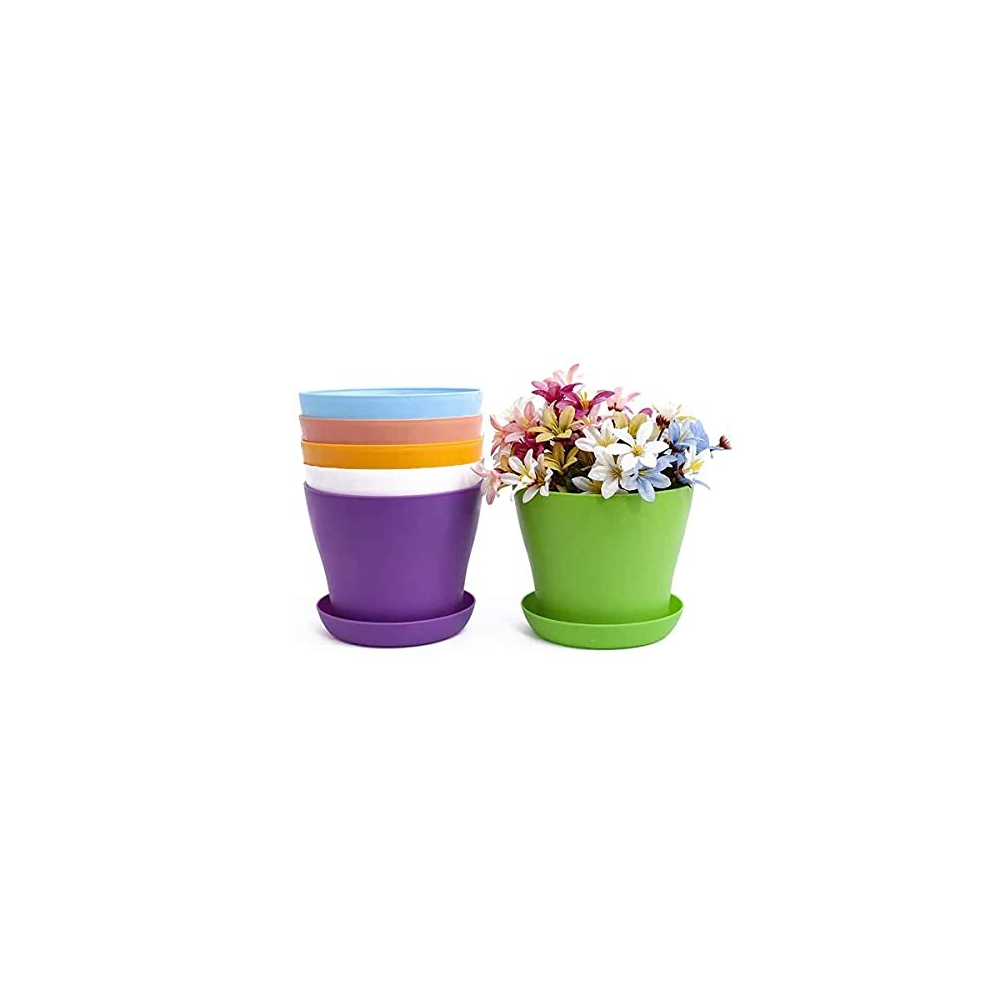 MUXINCAMP 6 Pack 7" Large Plastic Plant Pots with Drainage Hole and Saucer for Indoor and Outdoor (6 Colors)