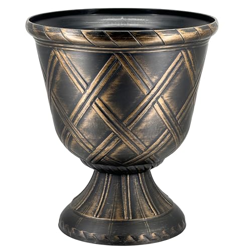 SG Traders Large Urn Plant Pot Stand, Flower Pots Outdoor Garden Planters, Indoor Plant Pot, Tall Planter with Drainage Holes Strong Plastic Black with Gold Outdoor Large Planters Urns D43 x H49cm