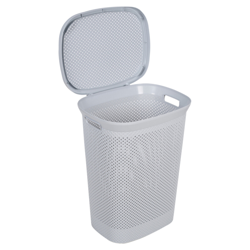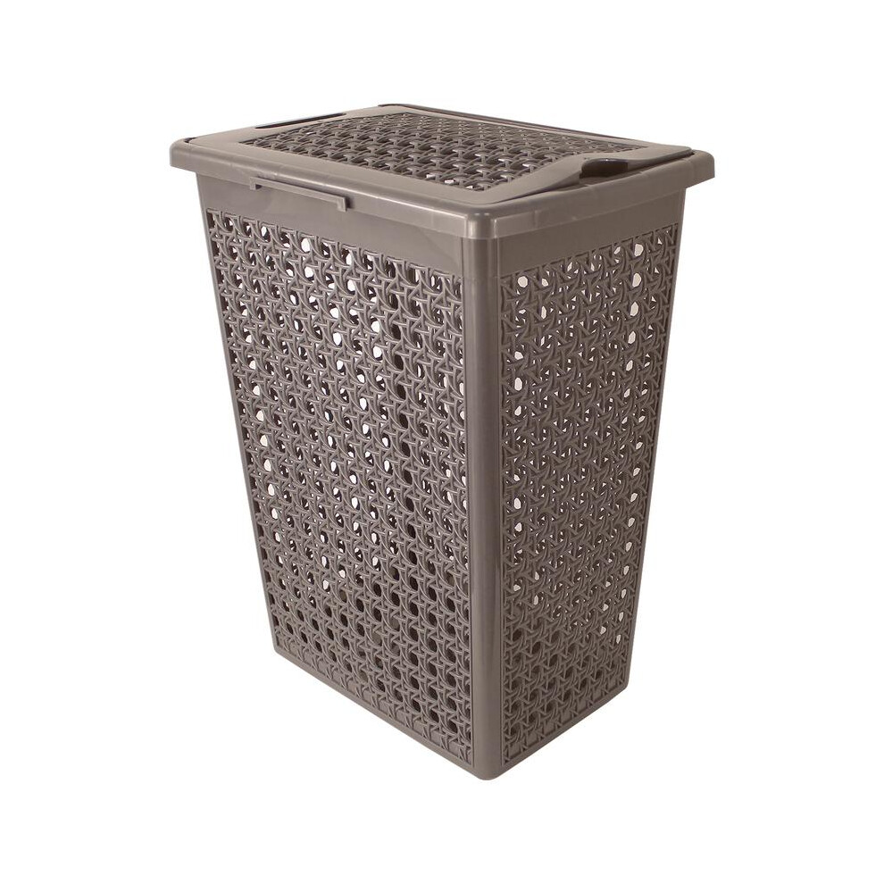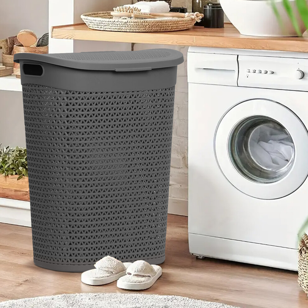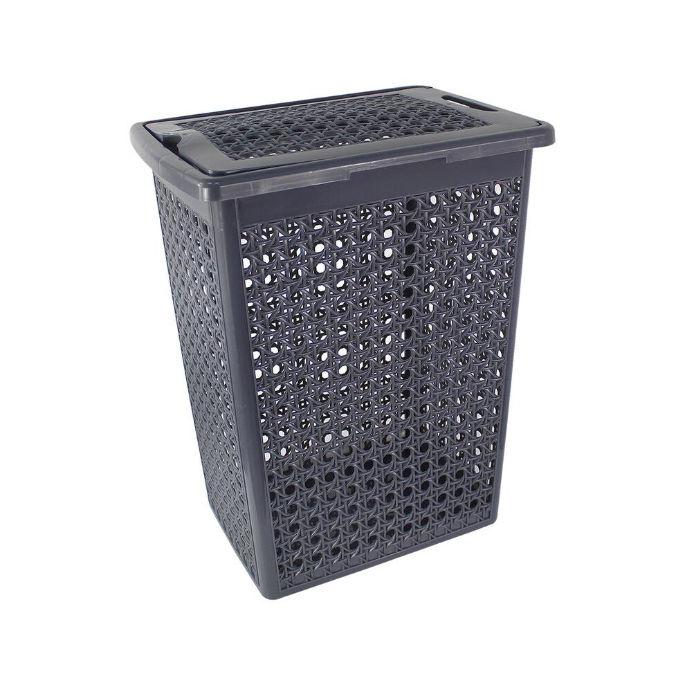 (Grey) 60 Litre Plastic Laundry Basket with Lid & Handles, Grey or White 60L Laundry Basket Curved Woven Rattan Plastic, Washing Basket Clothes