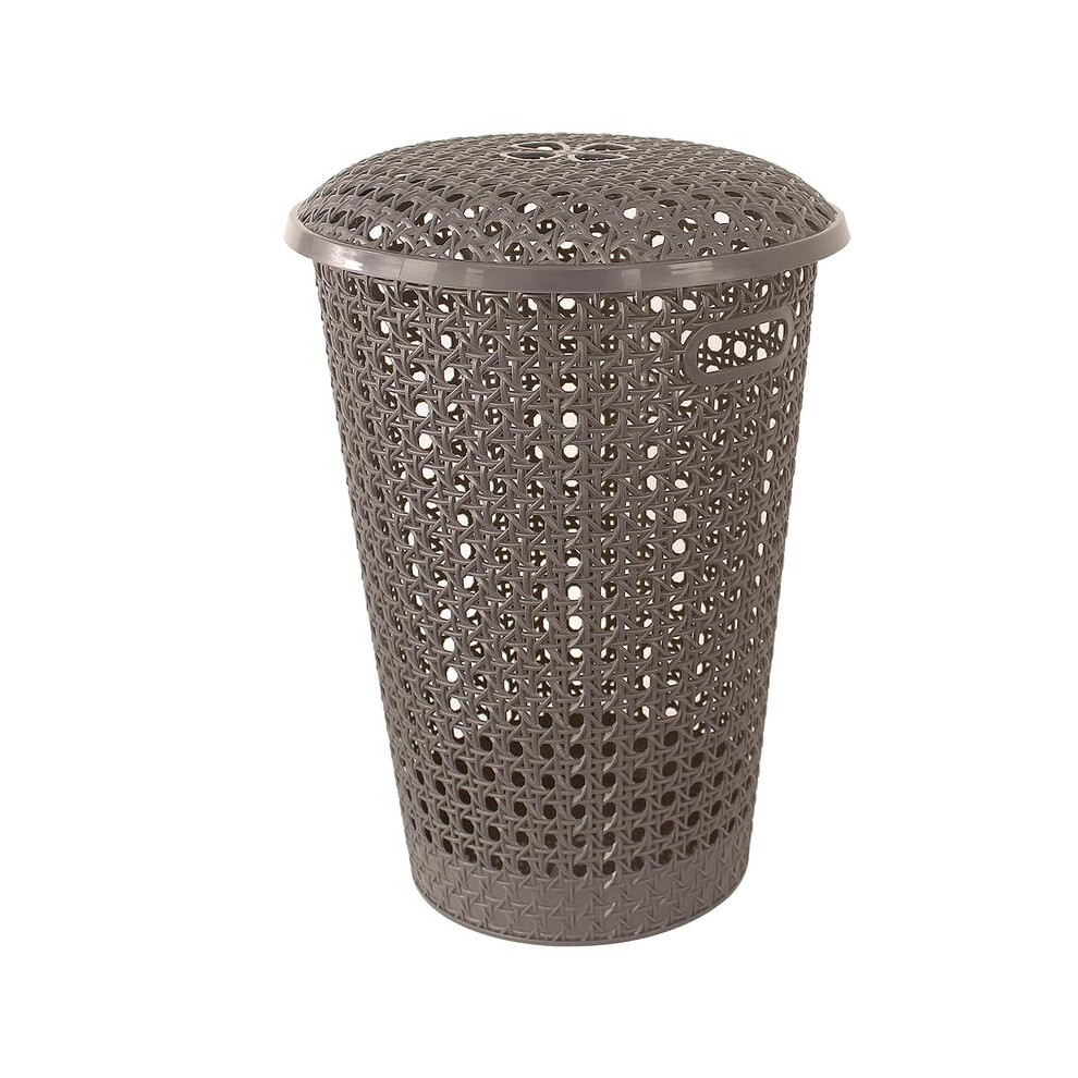 48L Plastic Laundry Basket with Lid - Large Round Washing Hamper with Handles for Clothes & Linen - Rattan Storage Basket for Bathroom, Bedroom & Utility Room - Grey, White or Taupe, 48 Litres (Grey)