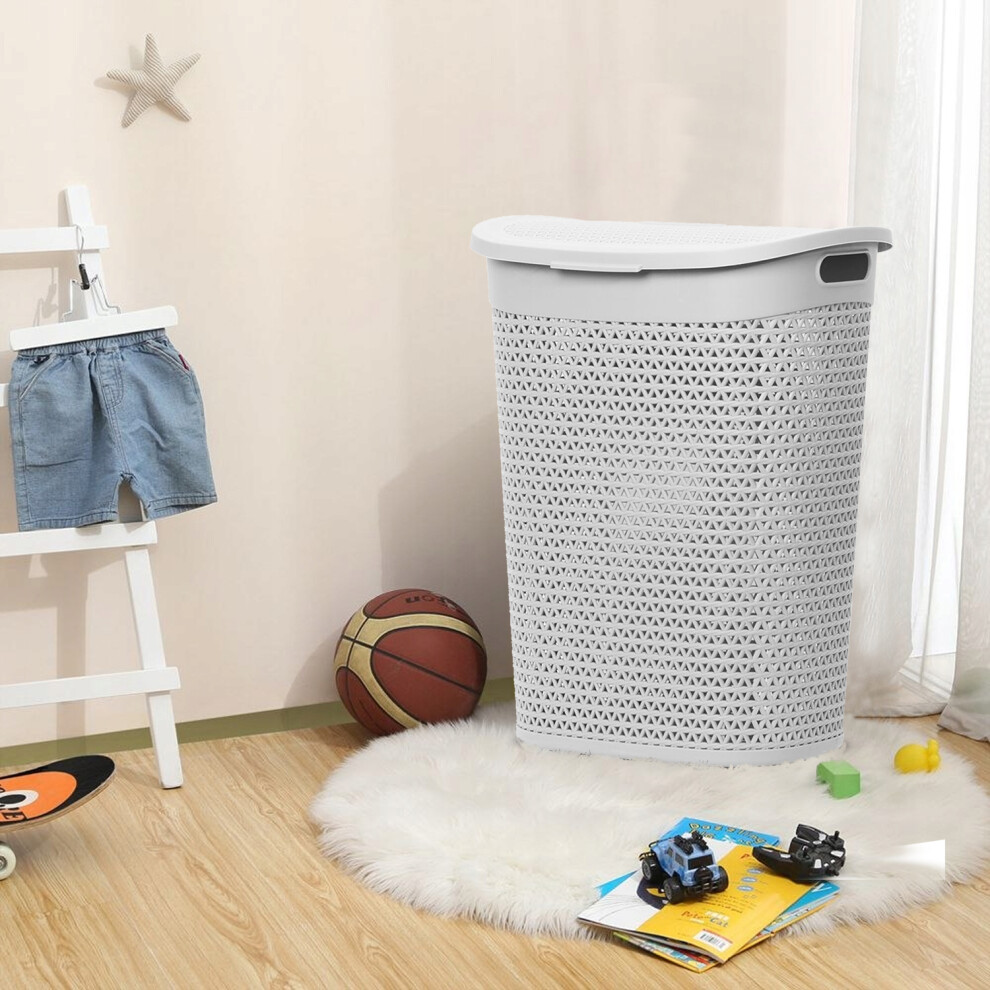 (Grey) 60Litre Plastic Laundry Basket with Lid&Handles,Grey or White60L Laundry Basket Curved Woven Rattan Plasticï¼home Storage Basket with Lid Orga