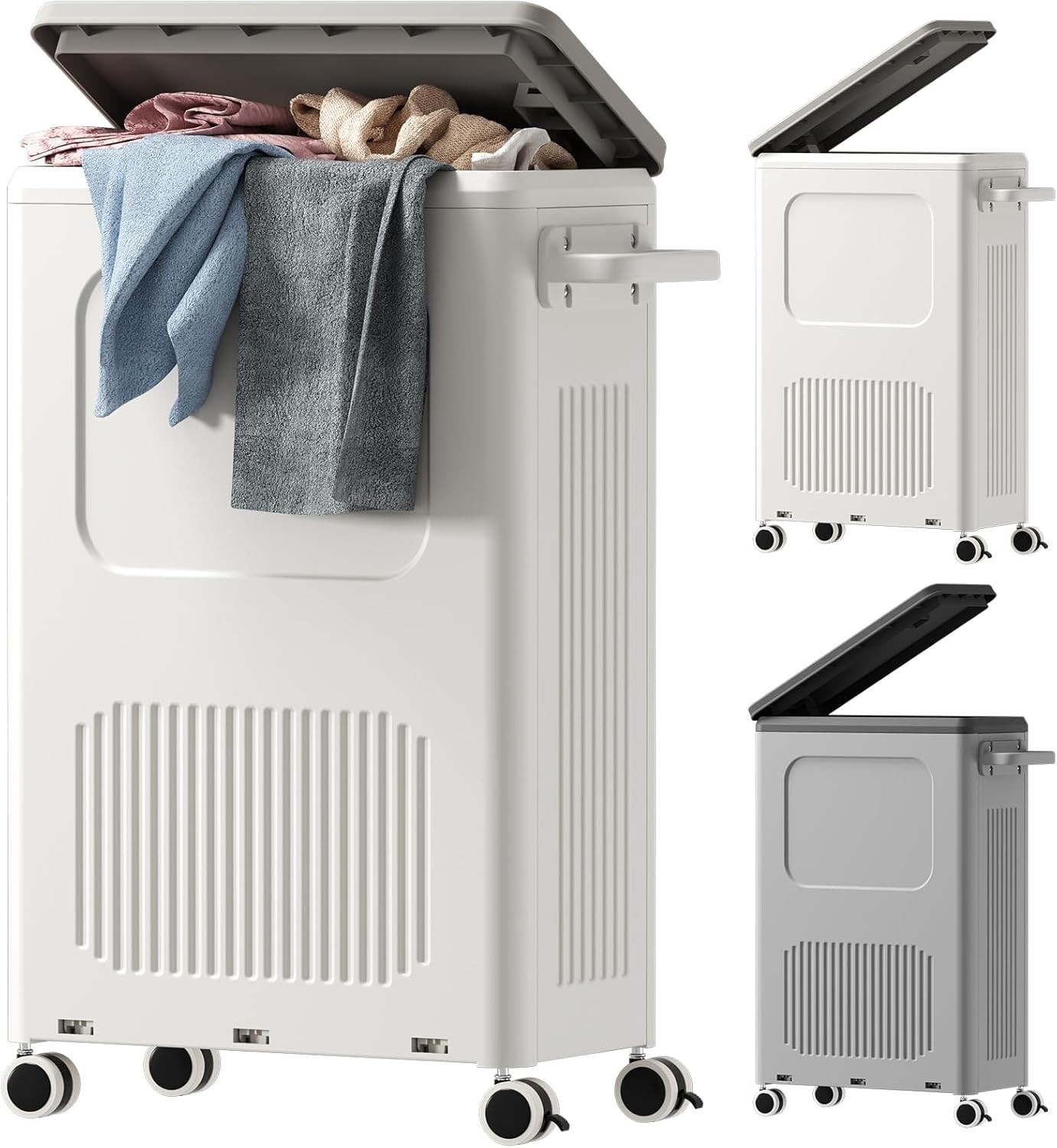 HAIXIN Plastic Laundry Basket with Lid - 50L Washing Basket with Wheels and Handle, Slim Dirty Clothes Basket 1 Pack, Large Laundry Hamper, Laundry Bin for Bathroom Bedroom Narrow Storage(Milk Grey)