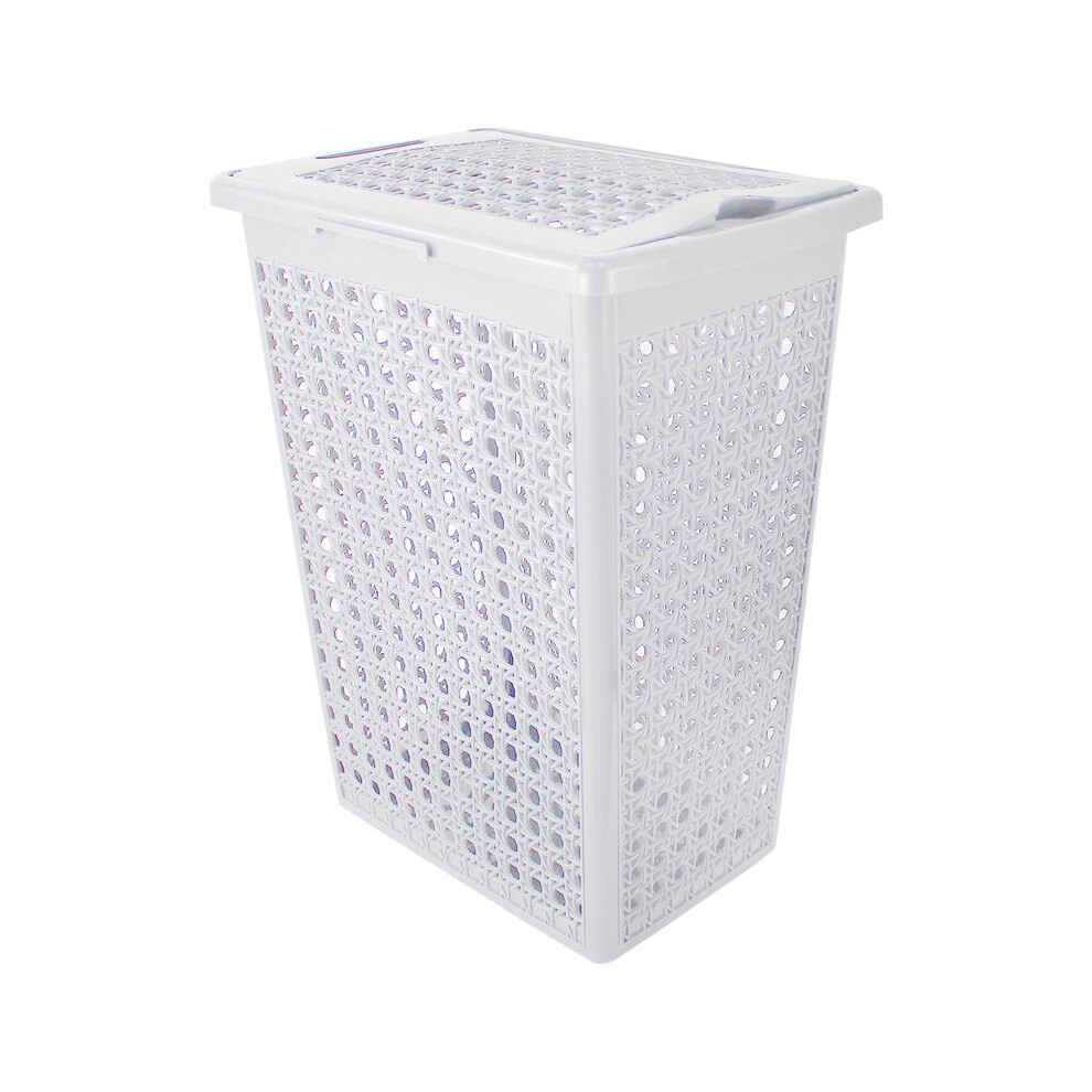 (White) 60 Litre Plastic Laundry Basket with Lid & Handles, Grey or White 60L Laundry Basket Curved Woven Rattan Plastic, Washing Basket Clothes