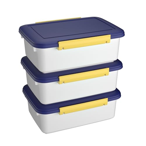 Cetomo 10L*3 Dog Food Storage Container, Airtight Food Containers, Silicone Seal and Snap Locks, Stackable Plastic Pet Food Bin with Lid for Dog, Cat, Bird, White & Blue & Yellow, 10L/3.5kg-3 Pack