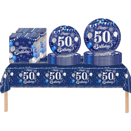 53Pcs Navy Blue 50th Happy Birthday Party Tableware Decorations for Him Plastic Table Cloth,7,9inch Paper Plates,Napkins for Men Birthday Table Party Tableware Set for Men Adults Birthday Party