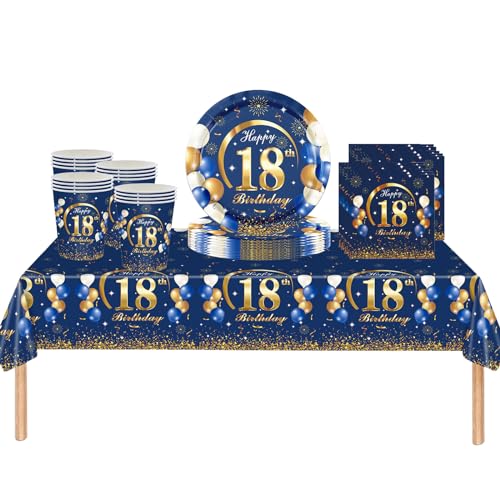 ATBEAMEN 53Pcs Navy Blue Happy 18th Birthday Party Tableware Plastic Table Cloth,Paper Plates,Napkins and Cups for Man Decorations Disposable Set Adults Party,(ATB-SStableware)