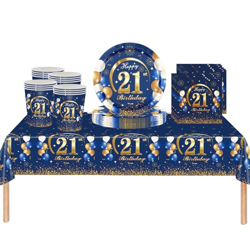 53Pcs Navy Blue Happy 21st Birthday Party Tableware Plastic Table Cloth,Paper Plates,Napkins and Cups for Man Birthday Table Decorations Disposable Party Tableware Set for Adults Birthday Party