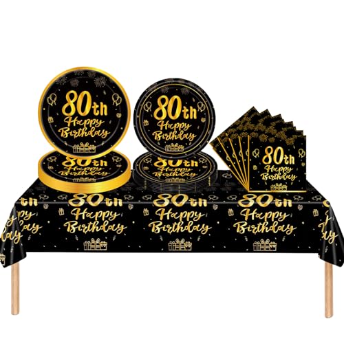 53Pcs Black Gold 80th Happy Birthday Party Tableware Decorations for Him Plastic Table Cloth,7,9inch Paper Plates,Napkins for Men Birthday Table Party Tableware Set for Men Adults Birthday Party