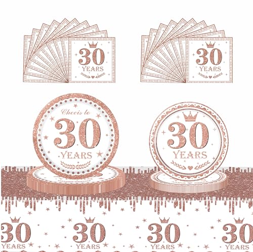 53Pcs Rose Gold 30th Happy Birthday Party Tableware Decorations for Her Plastic Table Cloth,7,9inch Paper Plates,Napkins for Women Birthday Table Party Tableware Set for Girls Women Adults