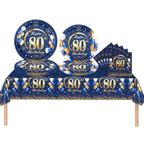 53Pcs Navy Blue Happy 80th Birthday Party Tableware Plastic Table Cloth,Paper Plates,Napkins and Cups for Man Birthday Table Decorations Disposable Party Tableware Set for Adults Birthday Party