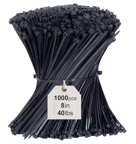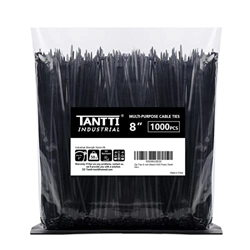 Zip Ties 8 inch Black Zip Ties 1000 Pack, Wire Ties with 50lb Tensile Strength, UV Resistant Cable Ties, Self-Locking Plastic Ties for Indoor and Outdoor Use, by Tantti.