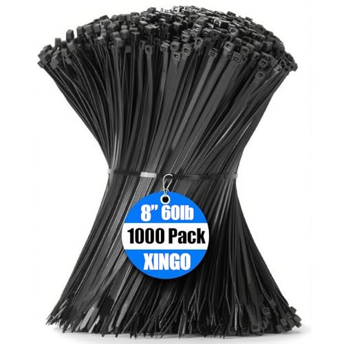 XINGO Black Cable Ties Pack of 1000, 200mm x 4.8mm, Premium Nylon Durable Zip Ties, Self-Locking UV Resistant Nylon Plastic Wire Ties for Indoor and Outdoor