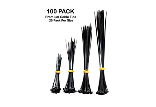 Accufix™ Premium Cable Ties Black - 100 Pack 3.6mm Zip Ties Heavy Duty, Cable Tie, Tie Wraps for Home, Office, Garden, Assorted in Sizes 100mm, 150mm, 200mm, 250mm, (25 Premium Plastic Ties Per Size)