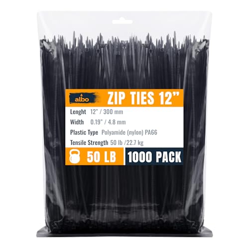 ALBO Black Zip Ties 12 Inch Long Premium Zip Ties Plastic Cable Ties Thick 0.19 Inch 1000 Pack Tie Wraps Heavy Duty 50lb UV Resistant Nylon Wire Ties for Indoor and Outdoor