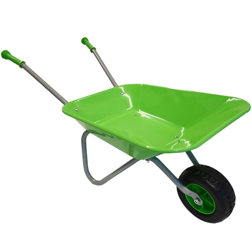 Kids Green Wheelbarrow, Gardening Toys, Metal Frame, Plastic Tray & Rubber Handles For Educational Outdoor | Included Accessories Gloves, Hand Trowel, Shovel & Rake (Green)