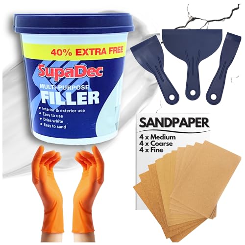 Wall Repair Kit With 1.4kg Ready Mixed Filler for Walls Holes & Gaps | 12 Assorted Sand Paper, Gloves & Plastic Filling Tools | Plaster & Wood Filler
