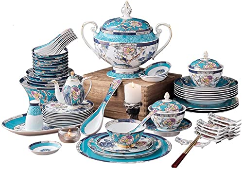 LXYAYY 70 Pcs European Court Dinnerware Sets Blue Butterfly Love Flower Bone China Food Bowl Chopsticks Spoon Dinner Plate Set