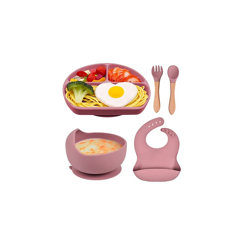 Baby Weaning Set, Silicone Baby Feeding Set with Suction Plate, Suction Bowl, Adjustable Bibs, Spoon & Fork Tableware Sets,5 PCS Soft Easy Wipe Clean