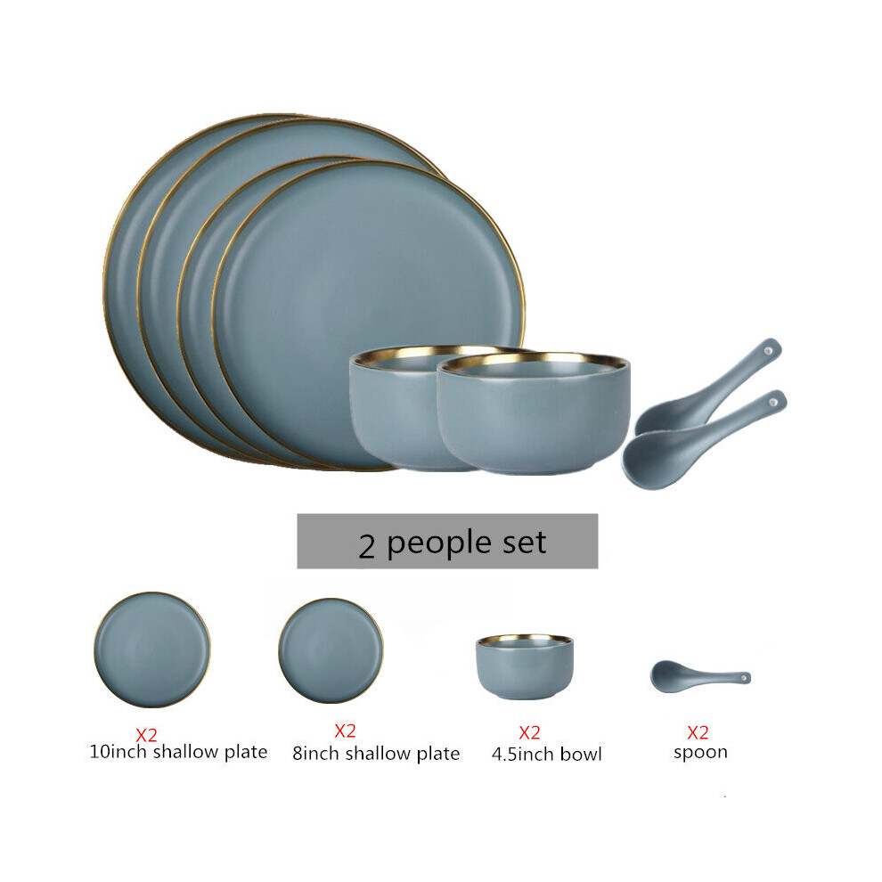 (a-2 people set) Matte Gilt Rim Ceramic Tableware Set with Spoon Cereals Bowl Dessert Plate Steak Plate for Dinner Gift Plates and Bowls Set
