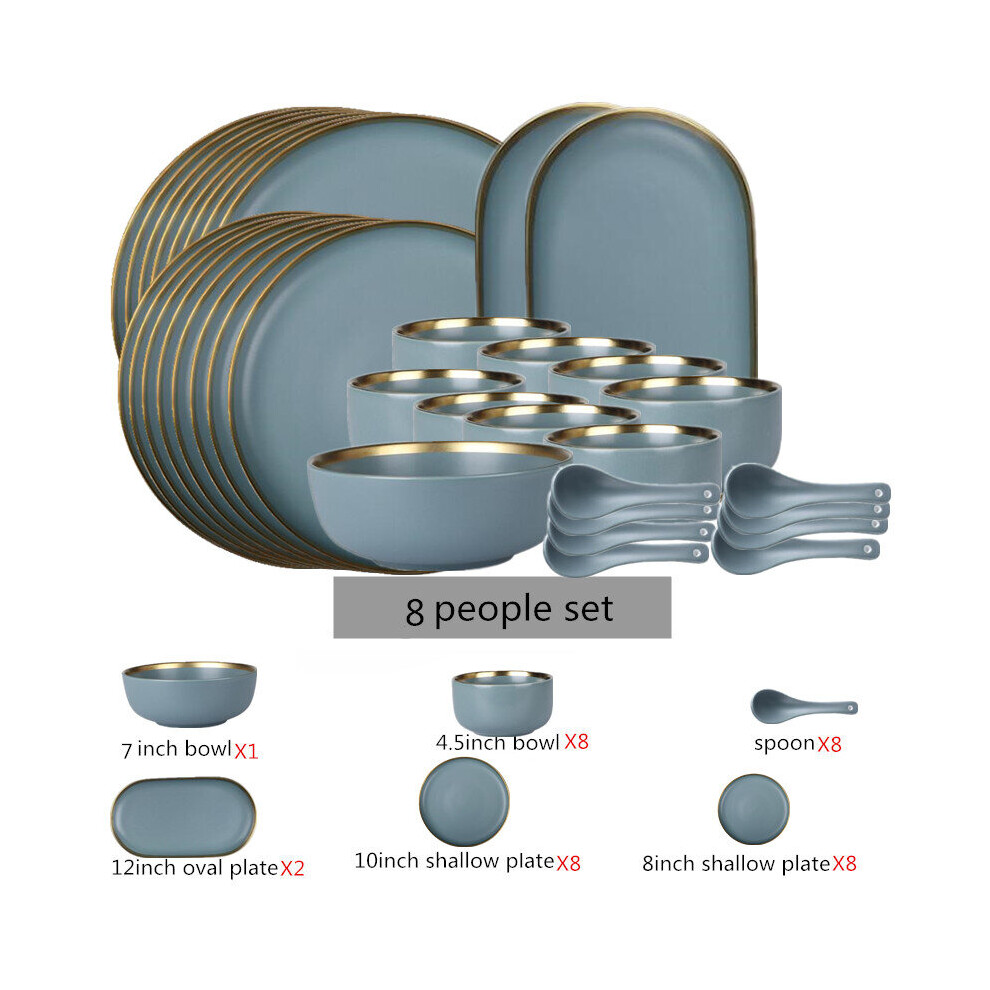 (a-8 people set) Matte Gilt Rim Ceramic Tableware Set with Spoon Cereals Bowl Dessert Plate Steak Plate for Dinner Gift Plates and Bowls Set