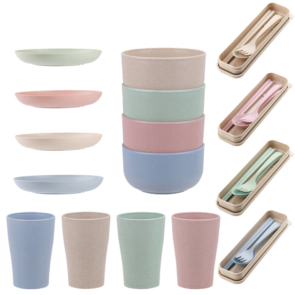 Yellow 48PCS Wheat Straw Dinnerware Sets Cups Plates Bowls With Cultery Spo OU