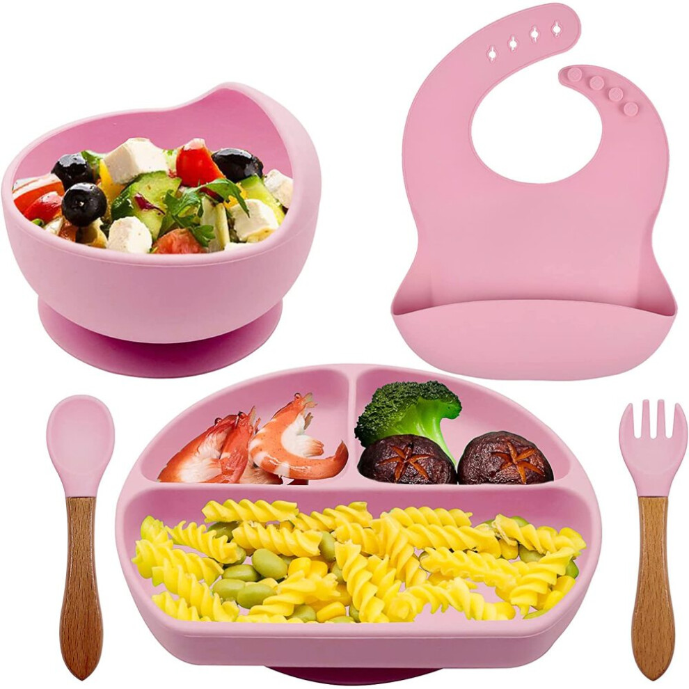 Baby Dining Set, Adjustable Fit Waterproof Silicone Bib with Food Catcher for Mess Proof Dining, Includes Plates with Suction Cups, Bowls, Spoons and