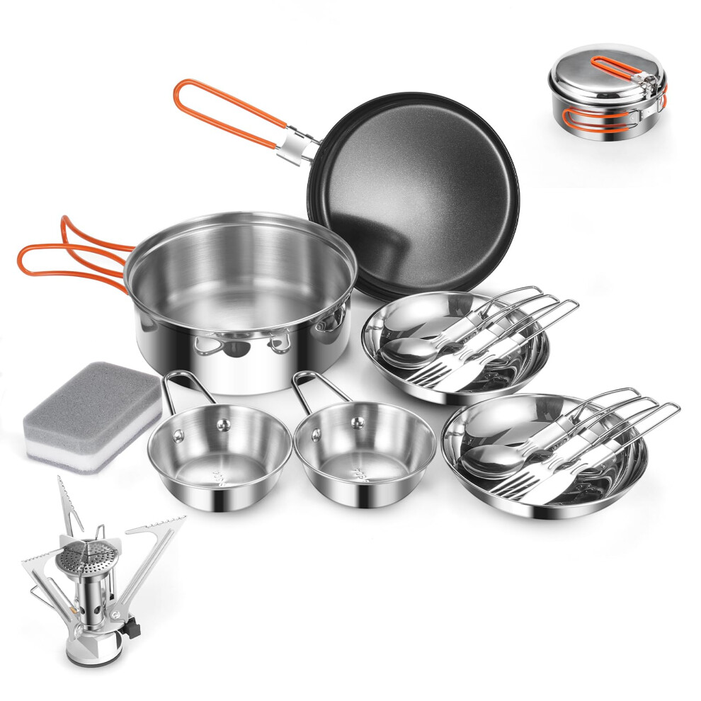 Odoland Camping Cookware Mess Kit with Folding Camping Stove 15pcs, Ceramic Non-Stick Cooking Set with Plates, Bowls, Forks, Knives, Spoons for