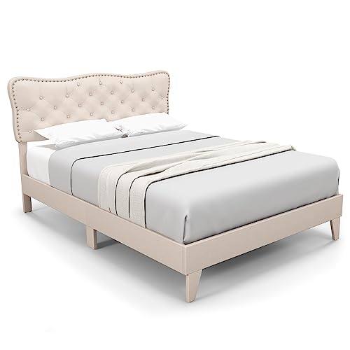 COSTWAY 4FT6/5FT Bed Frame, Double/King Size Upholstered Platform Bed Frame with Button Tufted Headboard, Wooden Slat Support Bedstead Base Mattress Foundation, No Box Spring Needed (4FT6 Double)