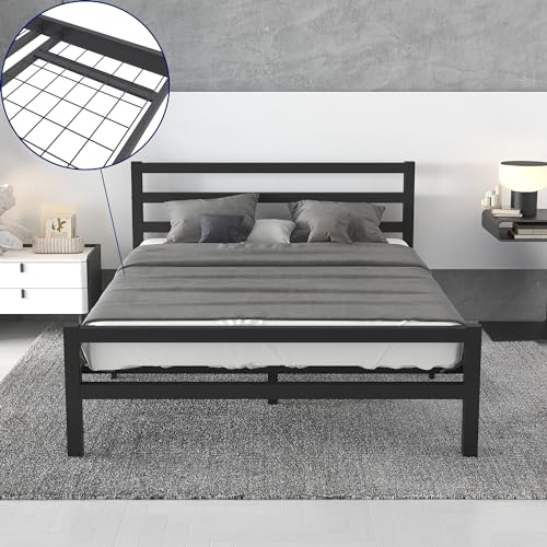 BOFENG Double Bed Frames with Wood Headboard,Heavy Duty Metal Platform Bed Frame Double Bed No Box Spring Needed,Mattress Base/Under Bed Storage/Sturdy Steel Slat Support