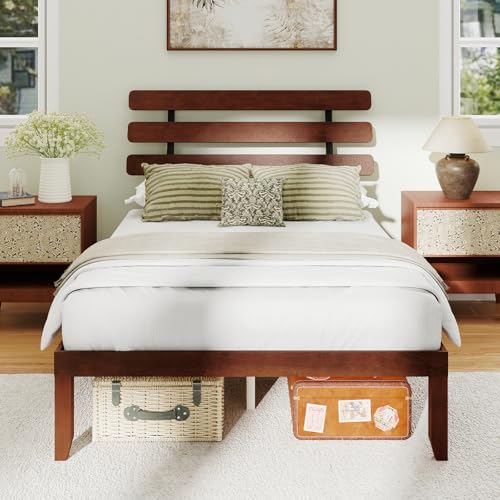 COSTWAY 4FT6 Double/5FT King Size Bed Frame, Solid Rubber Wood Platform Beds with Retro High Headboard and 30cm Underbed Storage, Wooden Slat Support Bed Base, No Box Spring Needed (Walnut, Double)