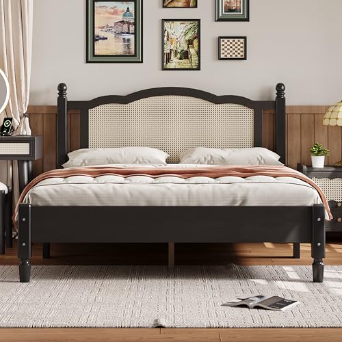 Ball & Cast Queen Size Wooden Platform Bed with Natural Rattan Headboard,Vintage Bed Frame w/Wood Slat Support,No Box Spring Needed,Platform Beds for Bedroom, Black