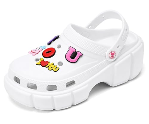 Womens Platform Clogs Slip On Slides for Women's 2 in High Heels Mules Clog Wedge Sandals Beach Slippers Waterproof Gardener Platform Clogs Shoes with Clogs Charms White 37