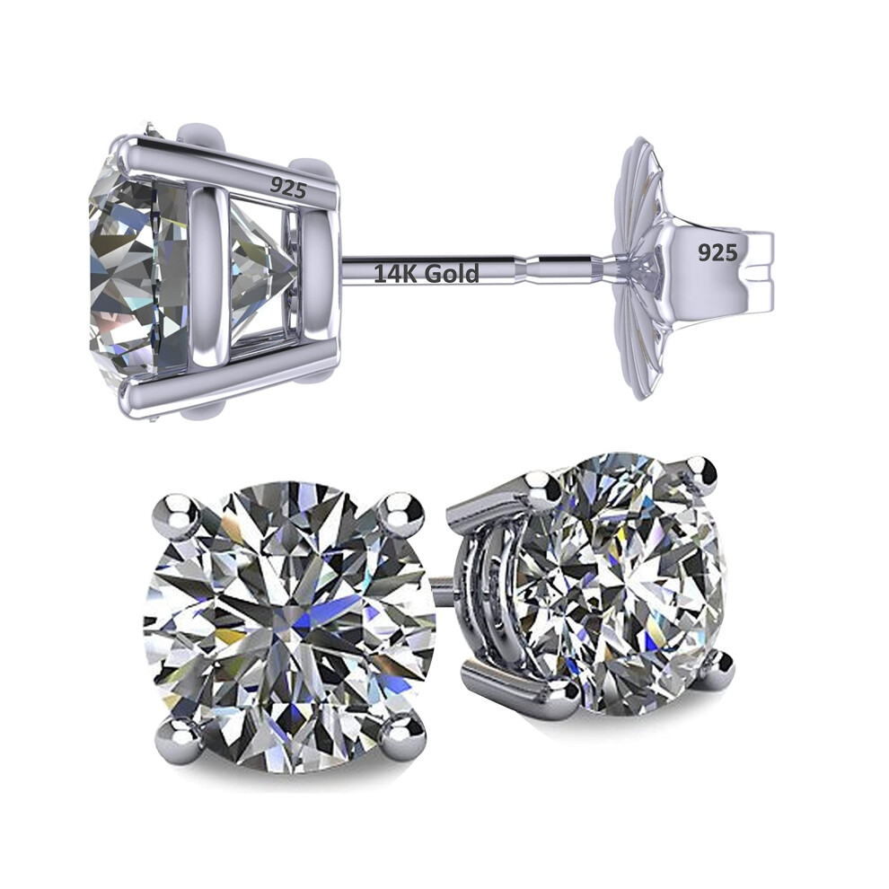 Central Diamond Center 14K Solid Gold Post & Sterling Silver 4 Prong CZ Stud Earrings - Platinum Plated - 5.50mm - 1.50cttw