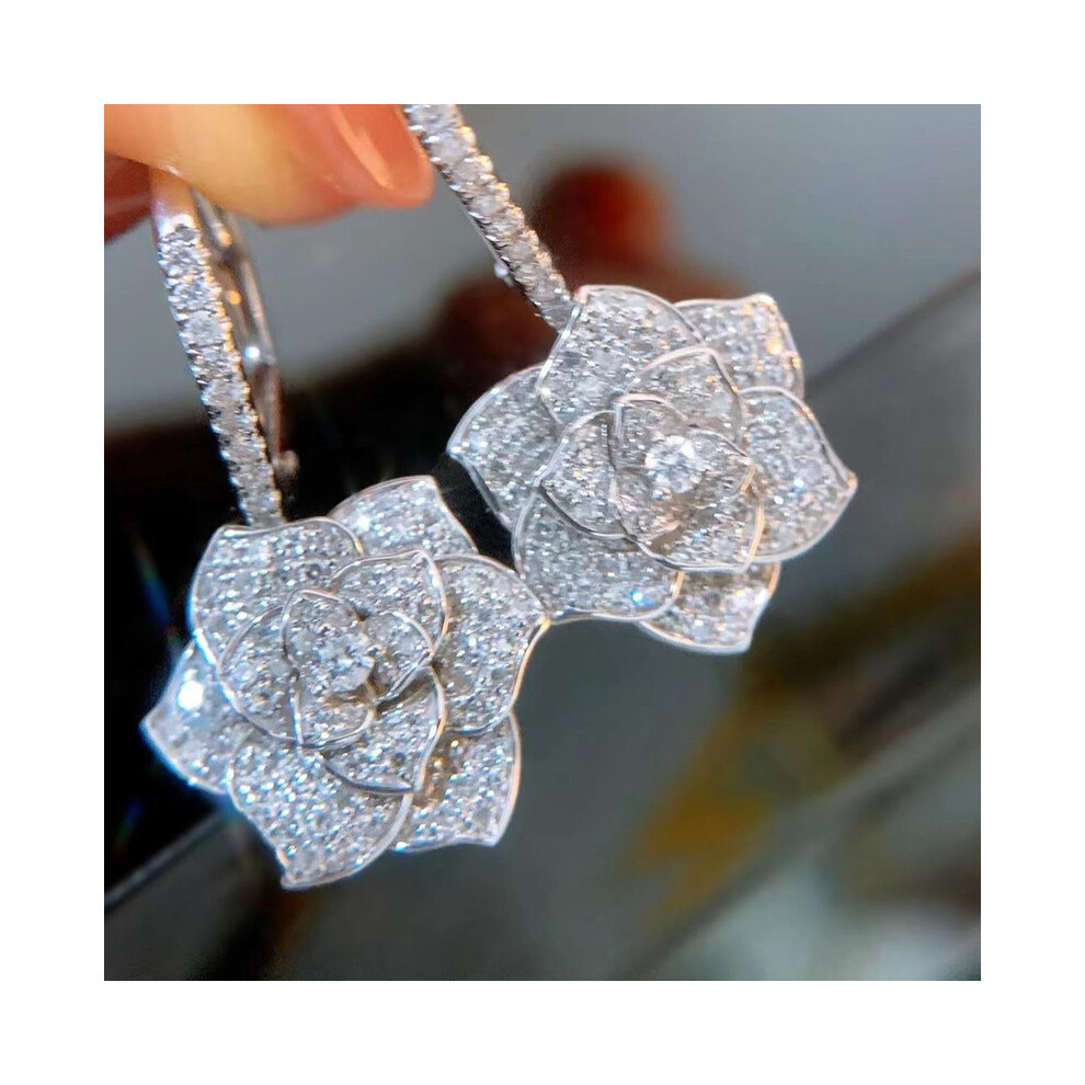 (E1588 Platinum) New Camellia Earrings for Women - Micro Pave Full Diamond Zircon Flower Drop Earrings, Ideal Holiday Gift