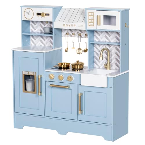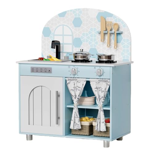 MAMIZO Wooden Play Kitchen with Real Sound, Children's Play Kitchens with kids kitchen Accessories, Toy Kitchen for Age 3+, Simulated Gas Cooker, Faucet, Cookware Utensils, Storage Cabinets (Blue)