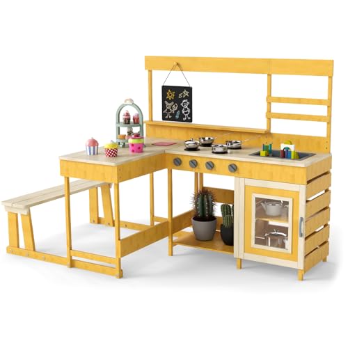 Maxmass Kids Mud Kitchen, Outdoor Toddler Play Kitchens with Picnic Table, Bench, Blackboard, Dessert Accessories, Kitchenware, Wooden Children Toy Kitchen Playset for 3+ Years Old (Yellow)