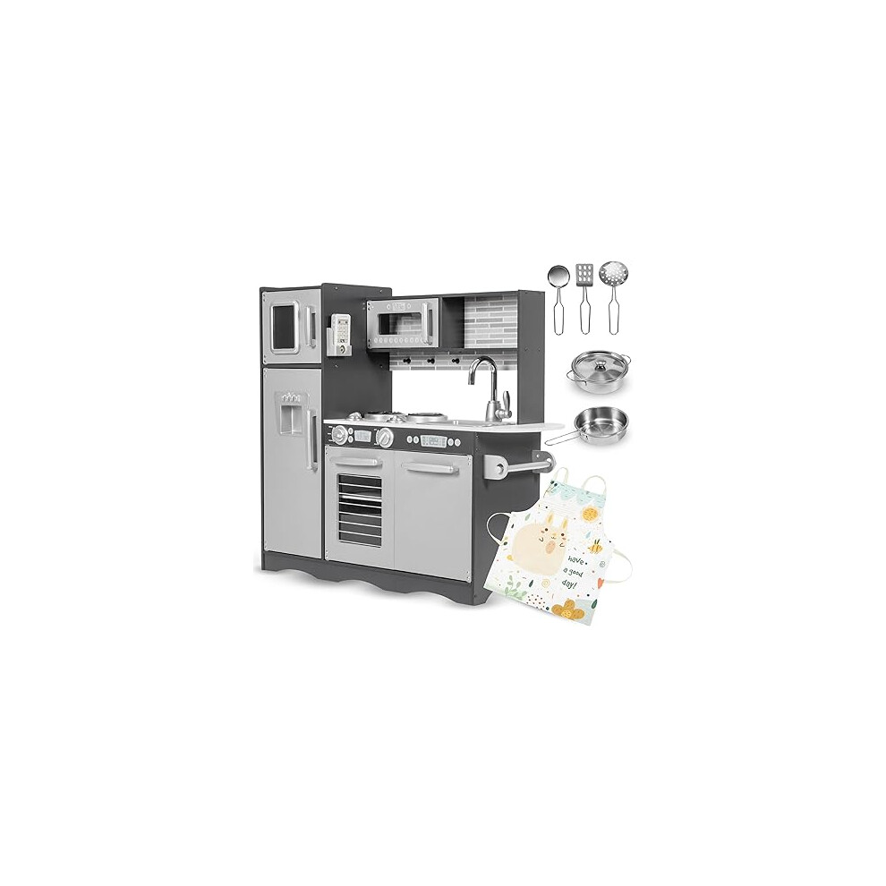 MAMIZO Wooden Play Kitchen with Real Sound, Children's Play Kitchens with kids kitchen 5 Pcs Accessories, Toy Kitchen for Age 3+, Simulated Gas Cooker, Clicking Knobs, Faucet, Storage Cabinets (Grey)