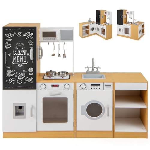 COSTWAY Wooden Kids Kitchen, Large Pretend Toy Kitchen with Realistic Sounds & Lights, Water Dispenser, Washing Machine, Blackboard, Cookware, Role Play Kitchens for Ages 3+