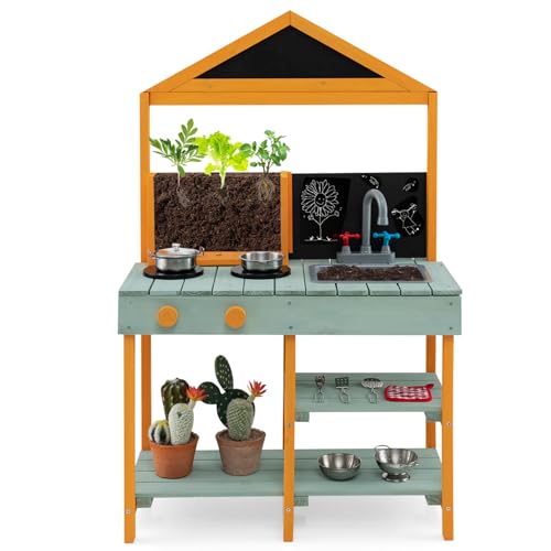COSTWAY Mud Kitchen, Fir Wood Outdoor Kitchen Playset with 4 Planting Pots, Removable Sink, Blackboard, Acrylic Board, Stoves, Kids Pretend Play Kitchens for Boys Girls Ages 3+