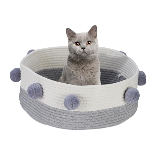 Relaxdays Cat Bed, Cotton Basket, Woven, Comfortable, Play Poms, House, Den, Pet, Nest, HxD 16.5 x 41 cm, Grey/White, 16.5 x 41 x 41 cm