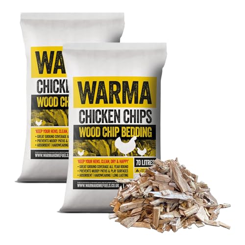 Warma Premium Chicken Wood Chips Hardwood Chippings - Poultry Bedding Coops Hens Run Animal Pens Garden Boarders Path Walkways Ground Covering Kids Outdoor Childrens Play Areas - 2 x 70Ltr Bags