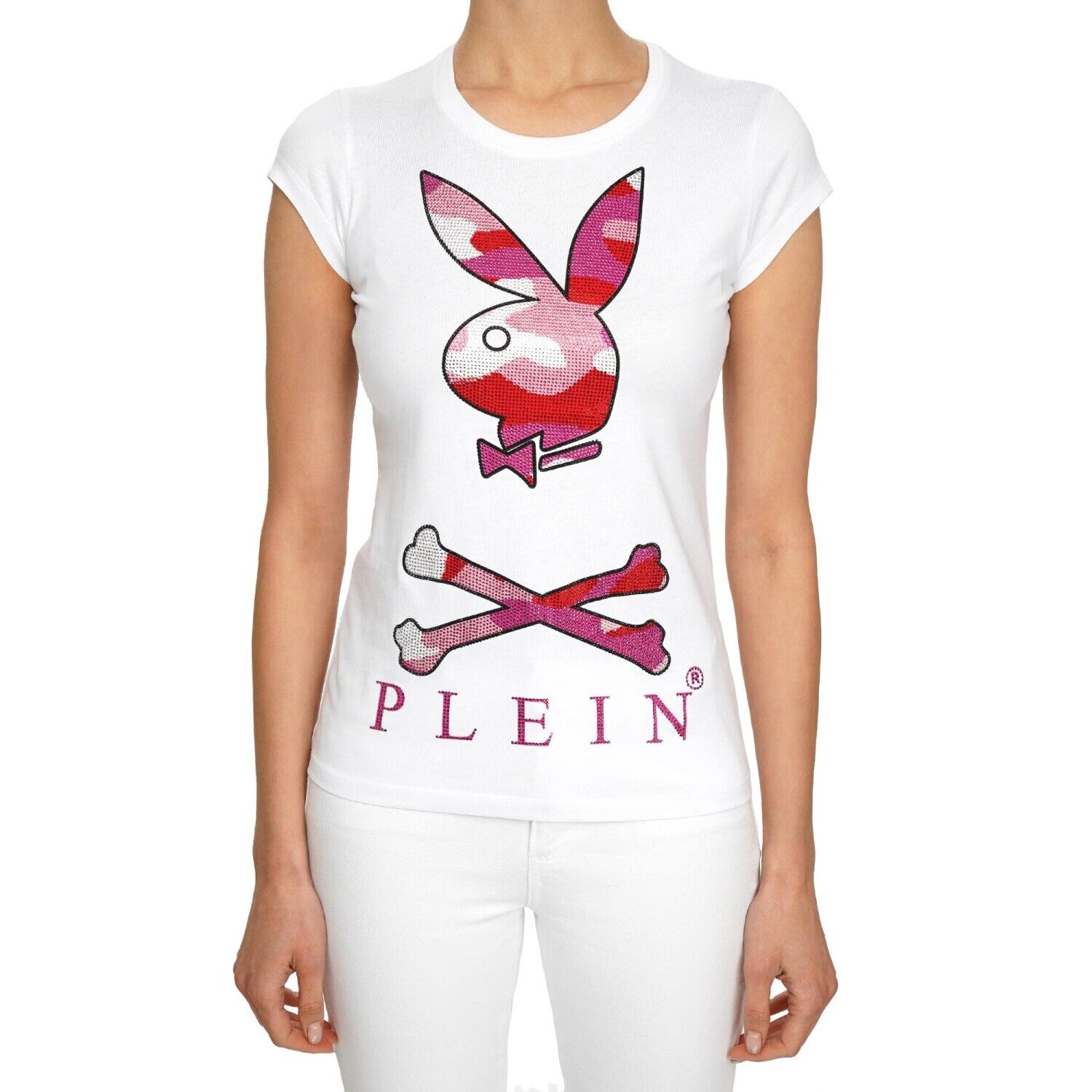 PHILIPP PLEIN X PLAYBOY Bunny Crystal T-Shirt White Pink Red XS US 2 08493