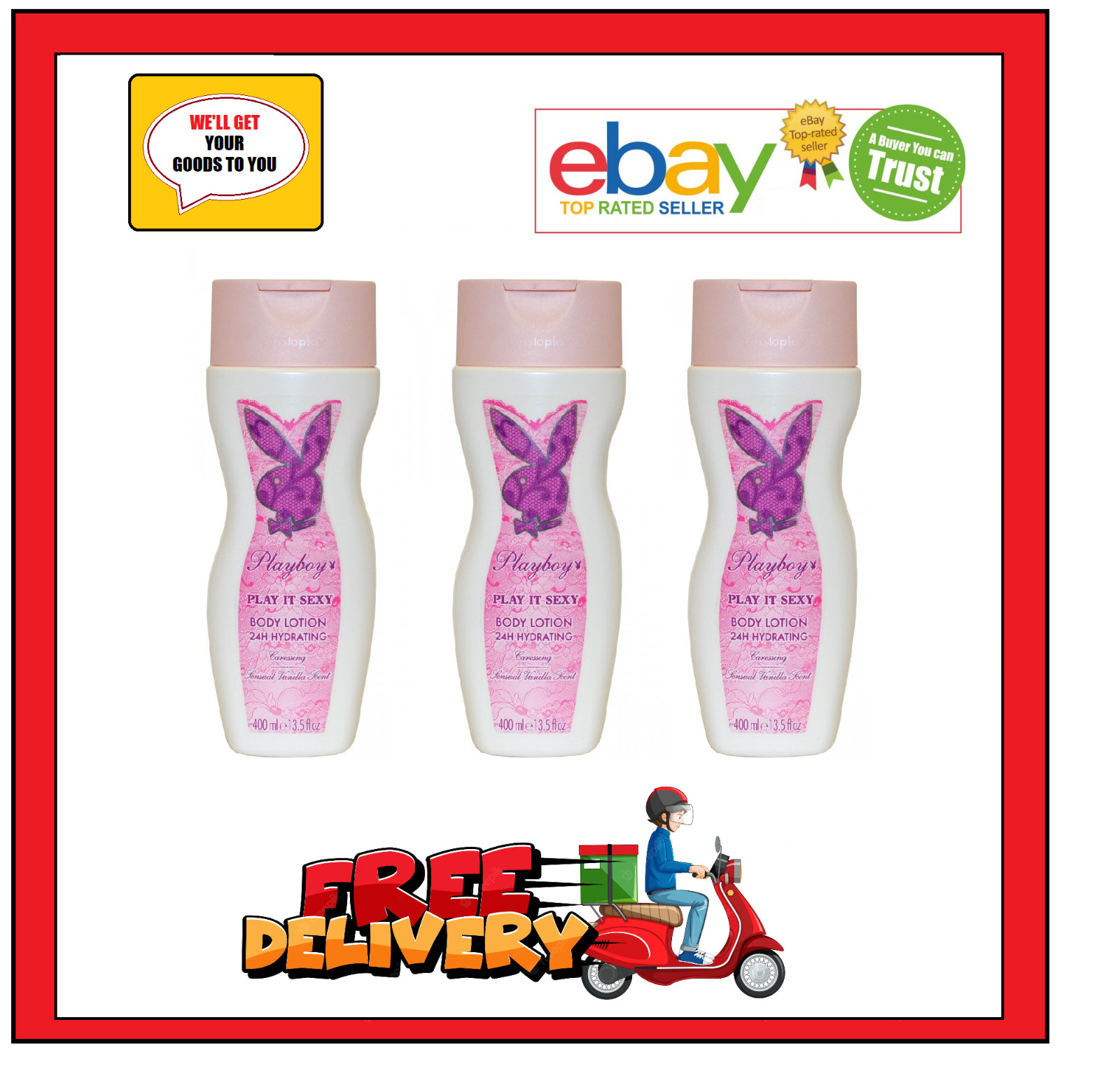 3 x 400ml Playboy Play It Sexy Body Lotion 24Hr Hydrating. Caressing. Vanilla