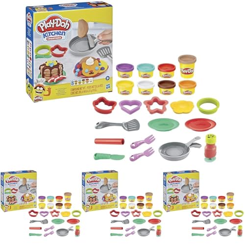 Play-Doh Kitchen Creations Flip 'n Pancakes Playset 14-Piece Breakfast Toy for Kids 3 Years and Up with 8 Non-Toxic Modelling Compound Colours (Pack of 4)