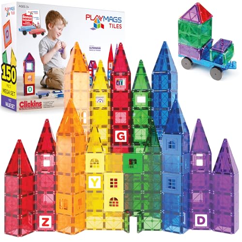 Playmags 150 Pcs Magnetic Tiles Set for Kids - 3 Colorful Stronger Magnets