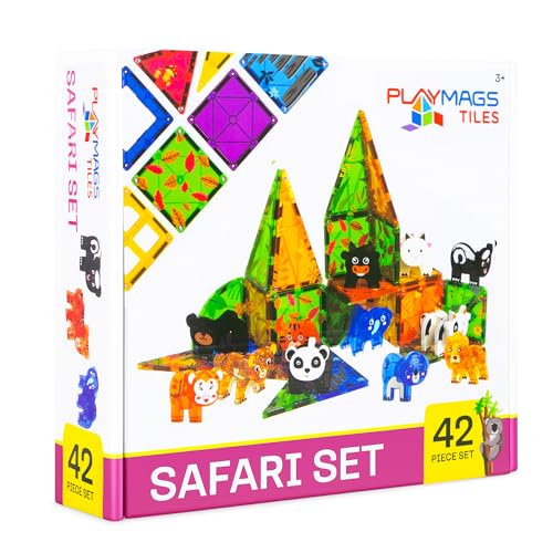 Playmags Animal Safari Magnetic Tiles for Kids - 42 Piece Set | Stacking & Building Blocks for Toddlers | Educational STEM Toy & Jungle Animal Figures
