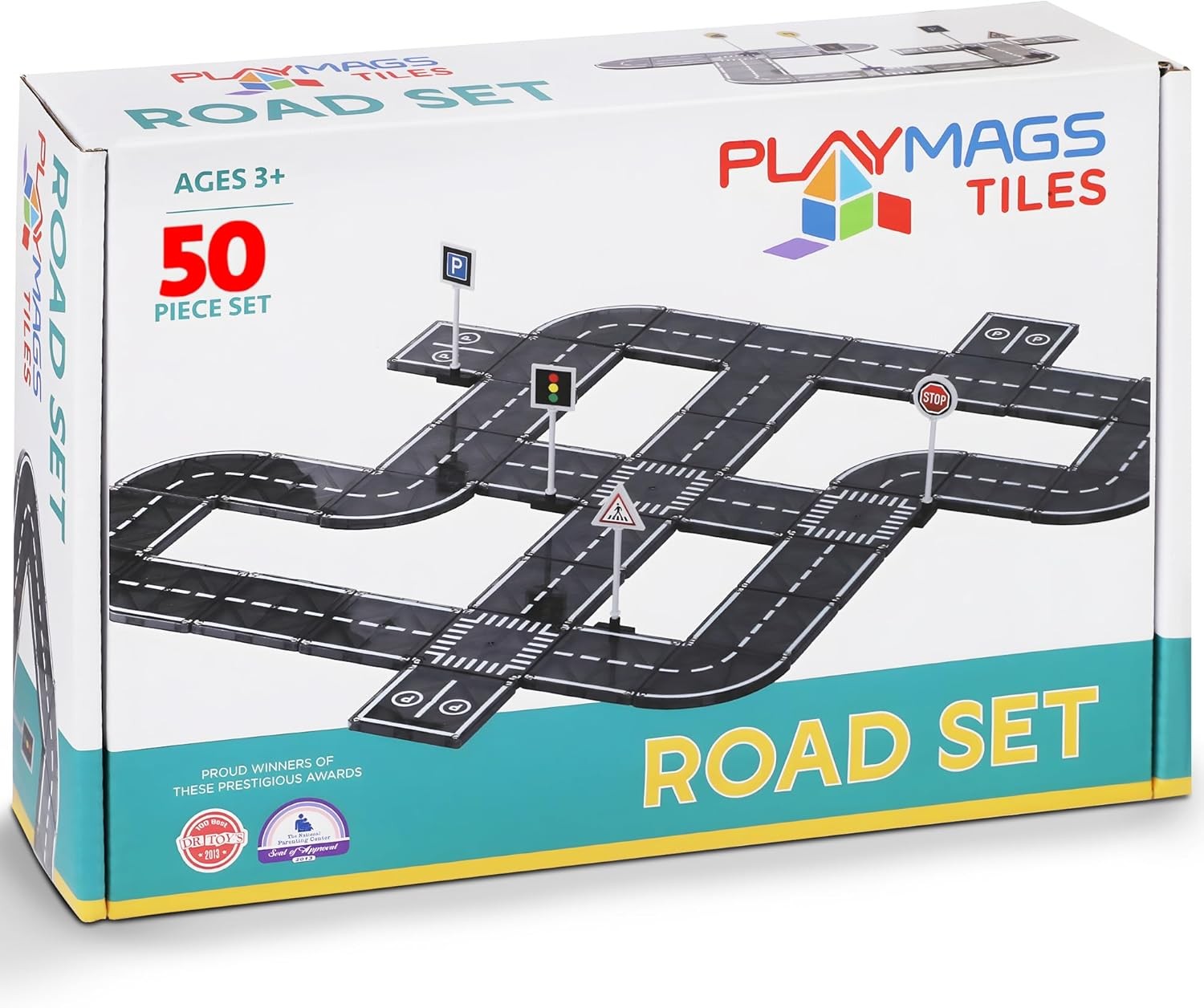 Playmags Magnetic Tiles Road Set - 50 Pcs STEM Educational Construction Toy Car Track, Building Blocks Magnet Toys for Toddlers, Safe for Ages 3+