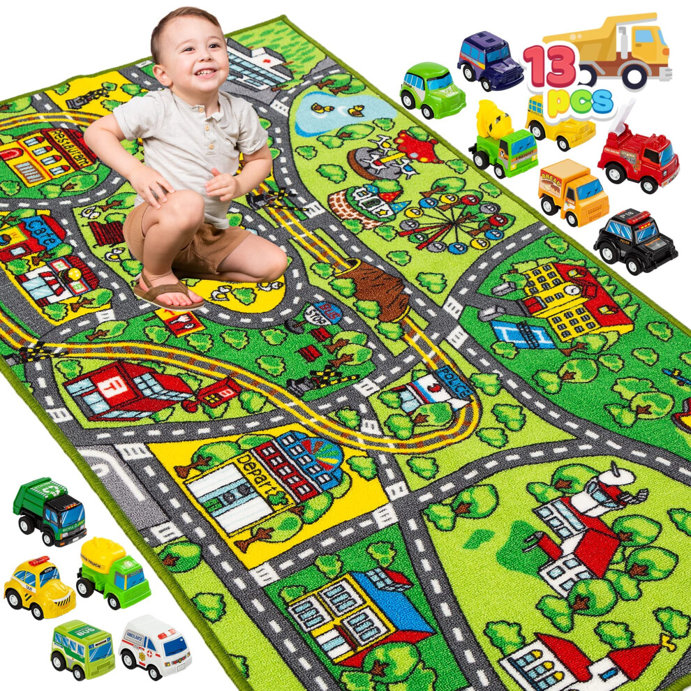 City Playmat Rug Toy for Kids Age 3 4 5 6 7 8+ with 12 Pull-Back Cars,Jumbo Room