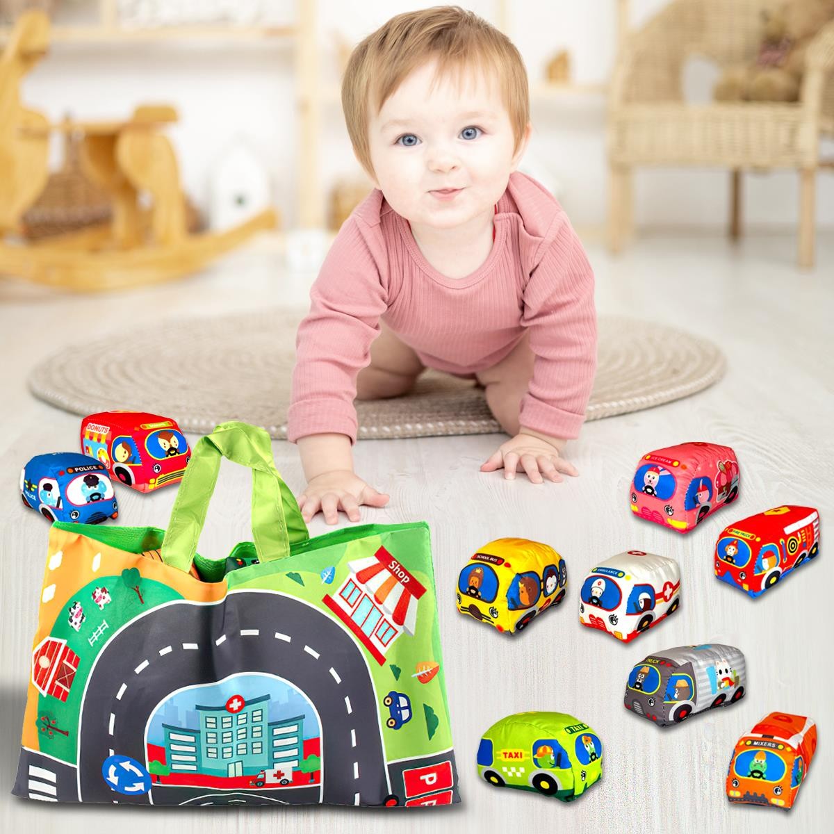 Plush 9 Cars Toy Set Foldable Playmat Storage Bag Soft Vehicles Crinkling Sounds