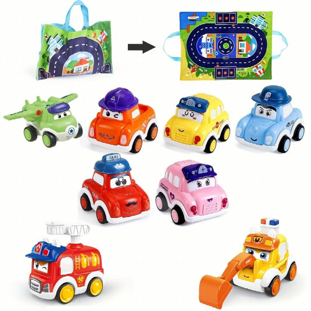 BLmukce Cartoon Cars Kids Toys for 3 Year Old Boys and Girls, Toddler Motor Vehicle Playset, Storage Bag, and Playmat, Birthday Gifts for Babies (8 Cars+Map)